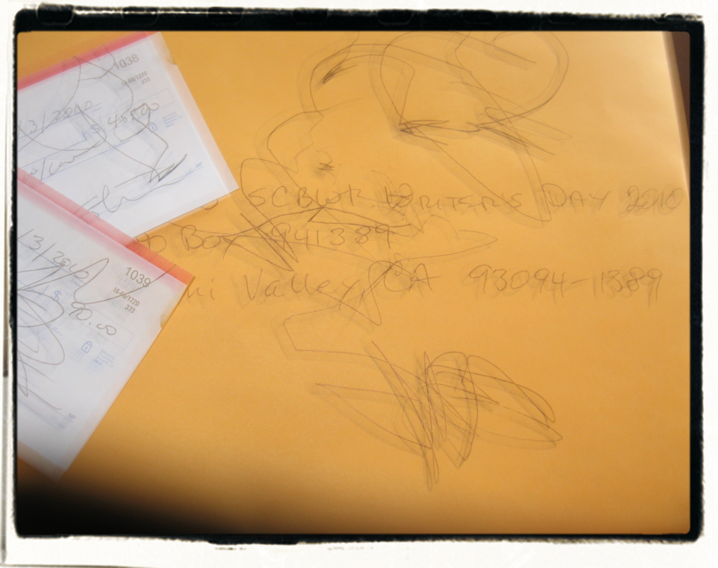 I realized I wanted to attend a children’s literature writer’s day. When I realized this, I also realized (with what felt like a bucket of icewater dumped on my head) that the deadline for registering for the writer’s day was in 2 days. This meant staying up until after midnight for 2 nights (my son rising at 5:30a.m. both of the subsequent mornings), scouring/editing the first 10 pages of my middle-grade novel and editing my synopsis. On the day of the postmark deadline, I frantically re-read my submission, emailed it to Kinko’s for printing (still no new printer), re-did the envelope and rewrote the registration checks after finding them scribbled on by my son—juggling these submission Musts with fixing breakfast, acknowledging toddler cries of delight over veggie sausage links and scrambled “eggy” and whatever intriguing scenes he was enjoying in his morning movie, “Cloudy With A Chance Of Meatballs”, cleaning up cat gak and helping my husband locate the shoe polish—in short: I prepared a submission in the midst of normal, chaotic everyday life on little sleep and dubious tasting coffee (will I EVER make the perfect cup?).