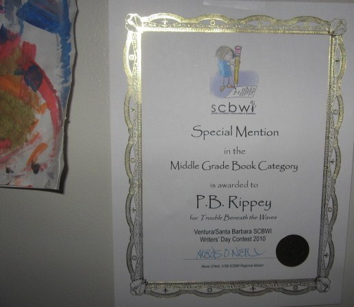 Trouble Beneath The Waves received a Special Mention at today’s SCBWI Writer’s Day. For some reason I thought winners of the contests (2 honorees in each category—Most Promising Manuscript and Special Mention) had already been announced and printed on the SCBWI website, so I almost fell out of my chair when my name was called. I also had my ticket picked out of a pumpkin and won half off admission to the next Writer’s Day. And I have a new immediate goal of pouring over my manuscript and getting it out to the editor I met today and whose business card is in my possession. For 7 hours I listened and learned in an appealingly dimly lit auditorium—with a lunch break (during which I met a YA writer from Tehachapi whose novel-in-progress sounds utterly intriguing). For 7 hours there were no dirty diapers in my life, no pets to appease, no tantrums to breathe through, no boo-boo’s to kiss, no meals to ponder and produce.