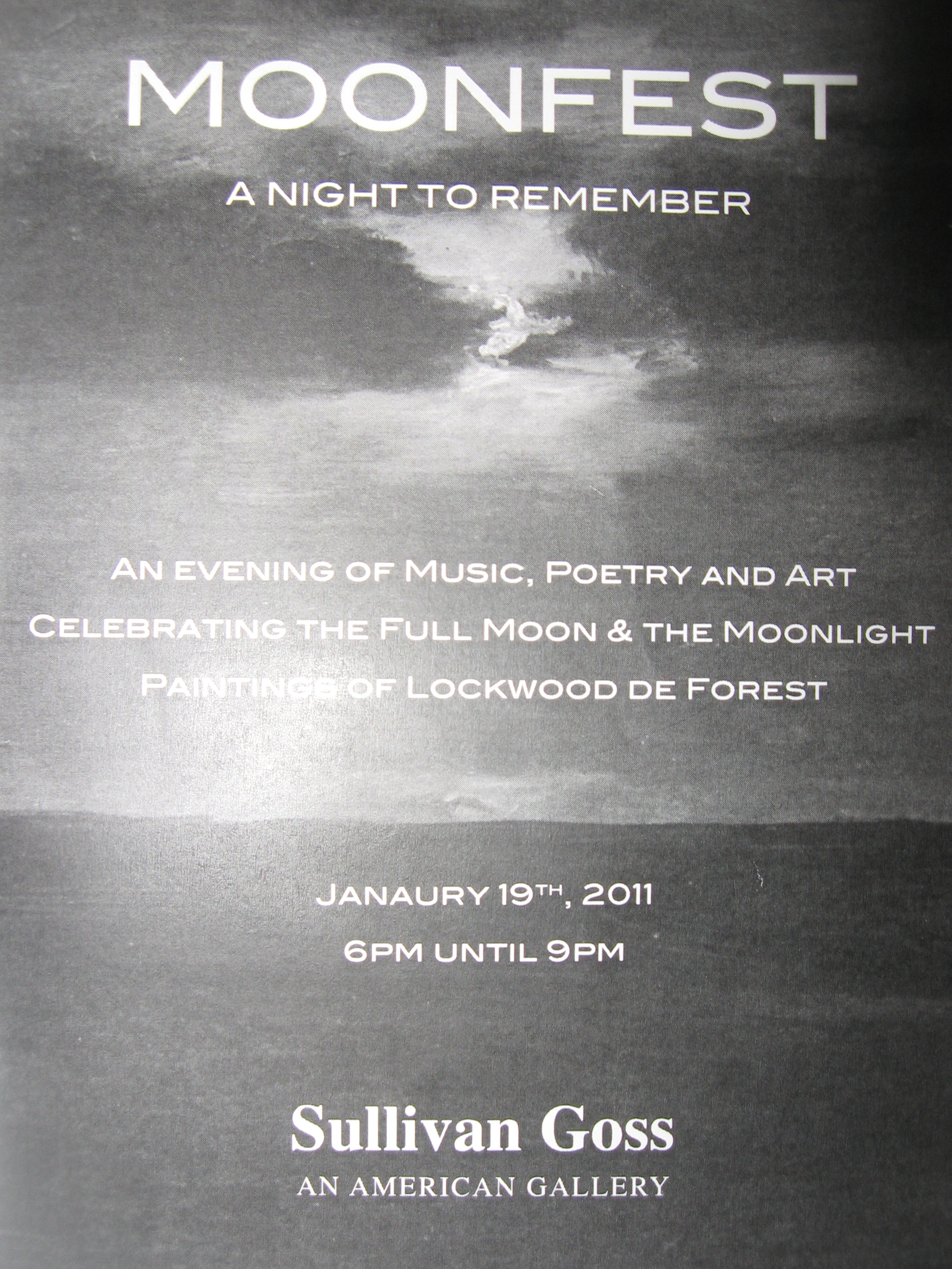 for his grandmother, my weariness from sacrificing a nap in order to get into town—lifted with the fog (lifting to veil the moon). Everywhere I turned there was an appealing view, inside and outside the humming gallery. My introduction to Lockwood de Forest? The beginning of a wistful awareness of his art. Poems were read on a raised stage in the courtyard, into a standing, silver old-fashioned microphone—the best kind. I read my poem—and heard myself. Eventually we moved into the cafe for the kind of dinner my son would never stand for: Delicacies in vertical. Divinely complicated dessert. The moon, yes, the music, right, the art, of course, the poets, bravo!—but more: In the company of two of my sisters, discussing the paintings, sharing that wistfulness, wine, moon(s)— hearing them…My son not needing me for any of those magical hours…It’s becoming imperative that we find a way to move home.