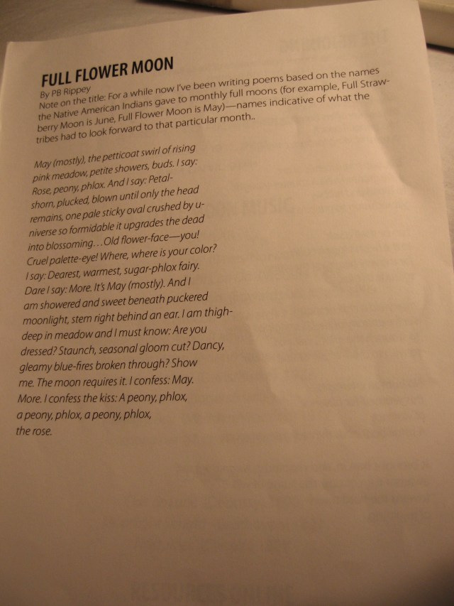 Shawls of cool sea fog wafted along Anapamu Street just in time for the event, chilling the artists set up on the gallery’s front patio and across the way—in front of the hushed, monolithic library—attempting to capture the full moon on their easels. I was handed a glass of wine and introduced to poets and songwriters and artists and local bookstore owners and scientists and professors and musicians (their full-moon-playlist as easy on the ears as the gallery’s outdoor courtyard—subtly festooned in twinkle lights—was on the eyes). Even though I hadn’t read yet, I did it: Relaxed. The atmosphere required it. The distressing traffic from L.A. to Santa Barbara, worry that my son didn’t eat enough dinner or wouldn’t sleep