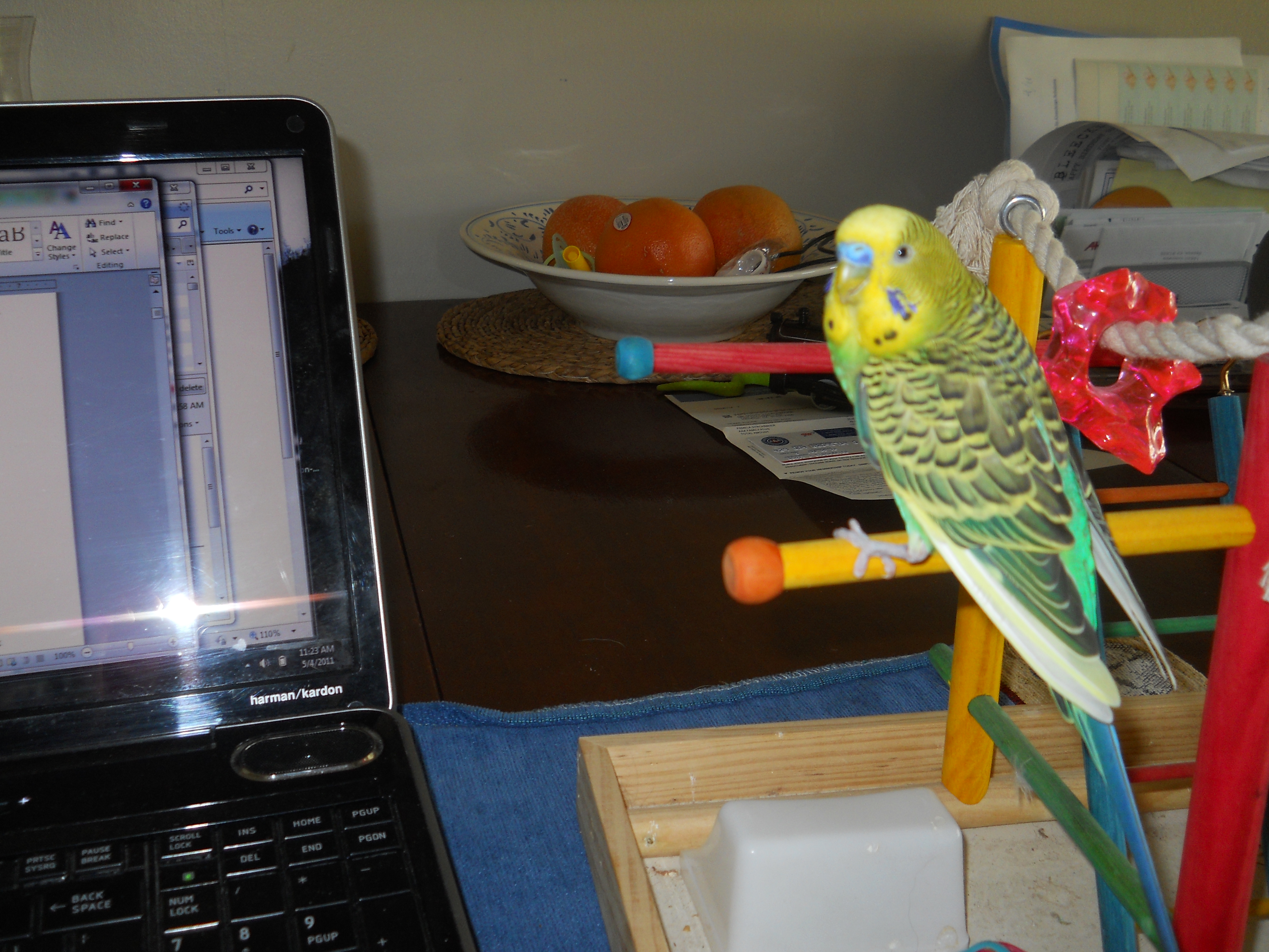 Speaking of muses, the included picture is of my morning’s perky muse. He monitored my every move, eyed the red chain on my reading glasses and emitted endearing whistles as I deliberately avoided Facebook, drank too much coffee and revised, revised, revised.