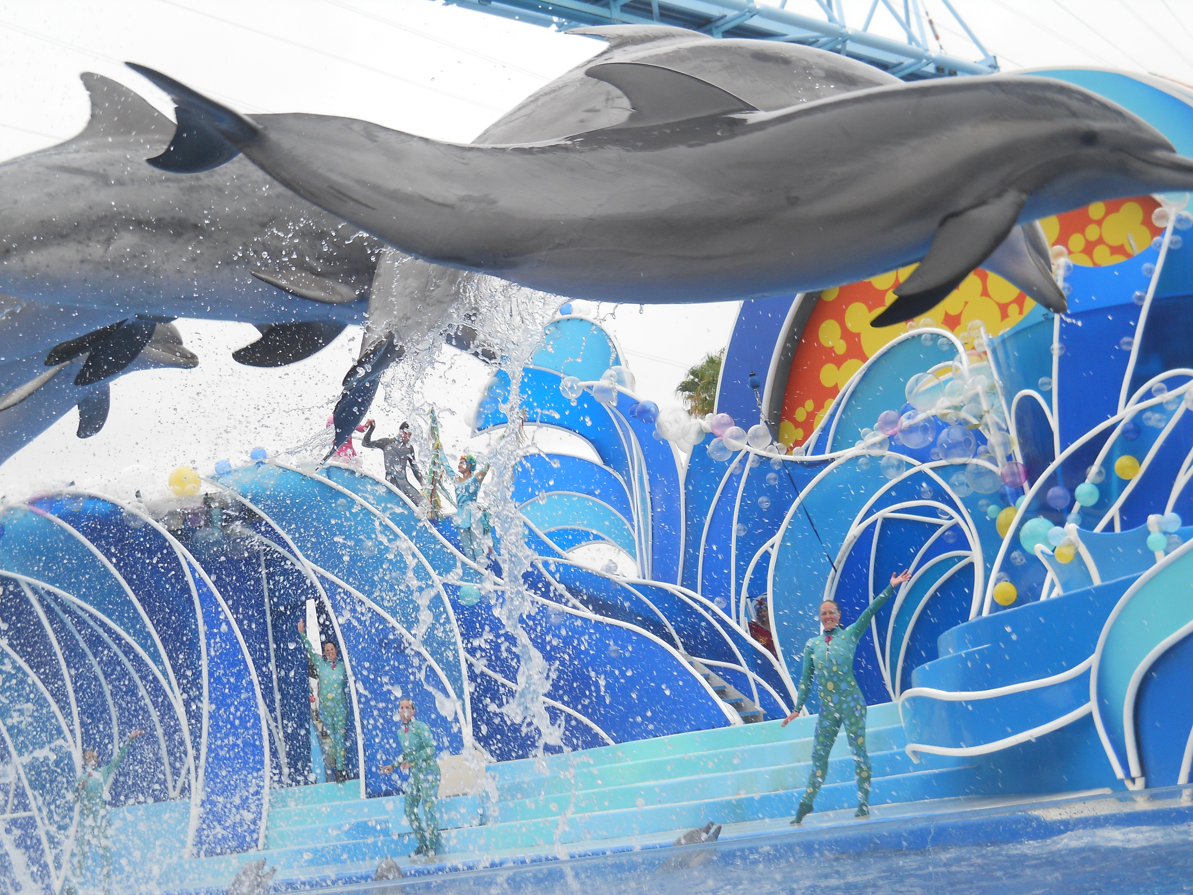 Throughout the park a Sea World conservation policy is repeatedly, blatantly touted. But aren’t they teaching that conservation= cages? SW successfully breeds dolphins in captivity, training the young for shows. Conservation? Or an abomination? The movie Truman kept popping into my head as I watched people “interact” with the trained beauties at Dolphin Encounter. One thing was for sure: No handlers got into the pool with the killer whales.