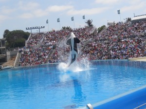 Many research scribbles in my notebook, now a crinkled, battered thing from sitting in the soak zones at the marine mammal shows. When you see dolphins, pilot whales and orcas that close, when sharks glide right over your head, when you eat lunch next to sea turtles, you discover many facts and impressions to record for Monday morning, when you sit down with your ocean-obsessed middle grade novel and recheck the checked facts embedded in every single page. Seeing penguins and puffins up close reminded me to incorporate them into my stories. Feeding seals, gazing at rays and starfish and a swimming polar bear—such conflicting feelings I had, especially when the crowd literally screamed with appreciation when Shamu and Co. shot up from the water. Can Sea World really awaken empathy in people for endangered species? Can Sea World make people want to stop the slaughtering of dolphins, the finning of sharks, the destruction of coral reefs?