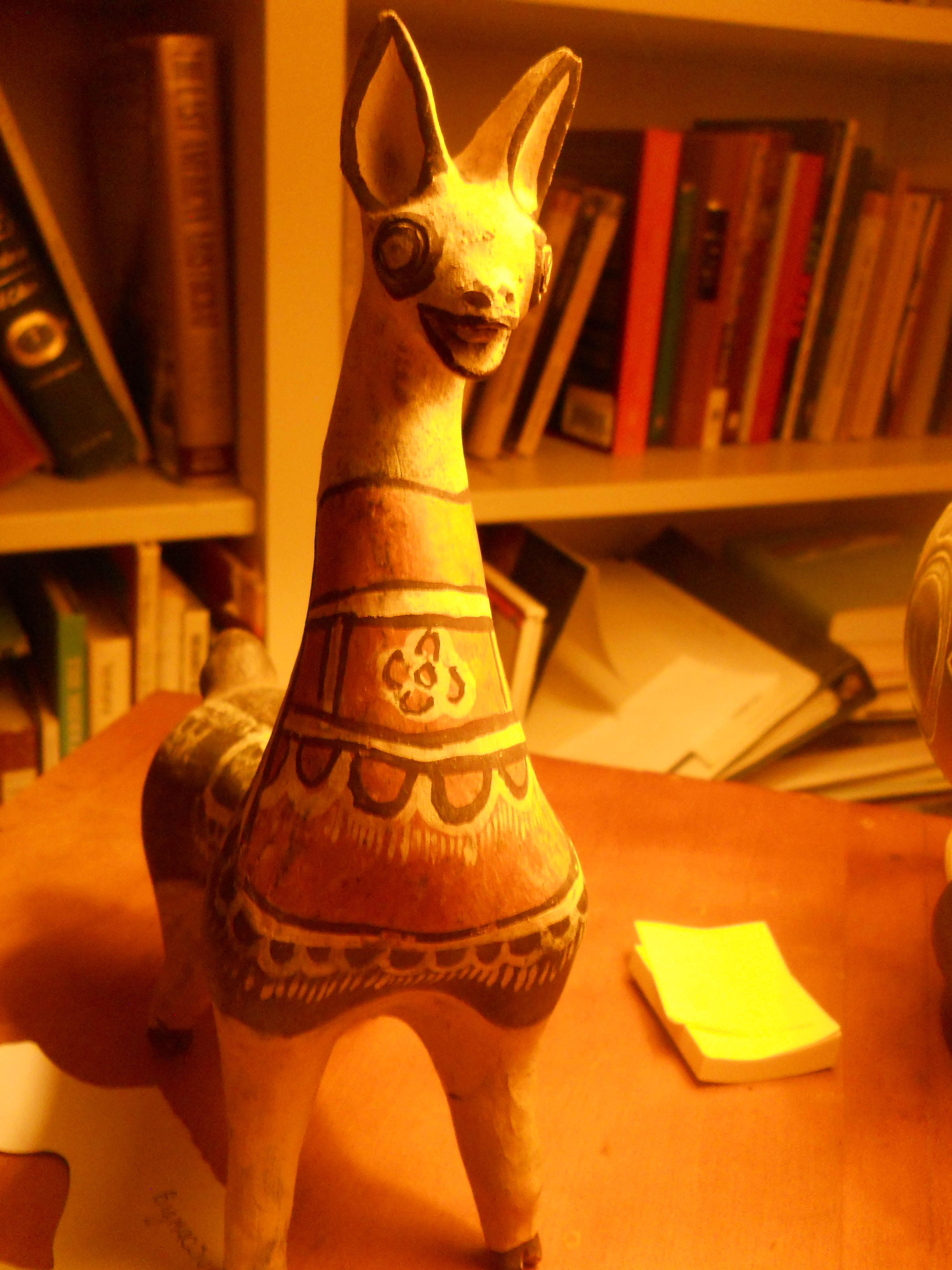His laugh: Vaguely hyena, part labrador-loose-in-the-surf, not mocking, but the tiniest bit cryptic, comically so. He made me want to write. Since it was too wonderfully cold for sitting outside by the fountain and attention-sucking candlelight, for two nights we kept company, this llama and I, as I revised and created by the spersed glow of an obviously eclectic lamp. Whenever I glanced up from the screen, there was his face, laughing me on. Odd little muse. Crude. Fine. Friendly.