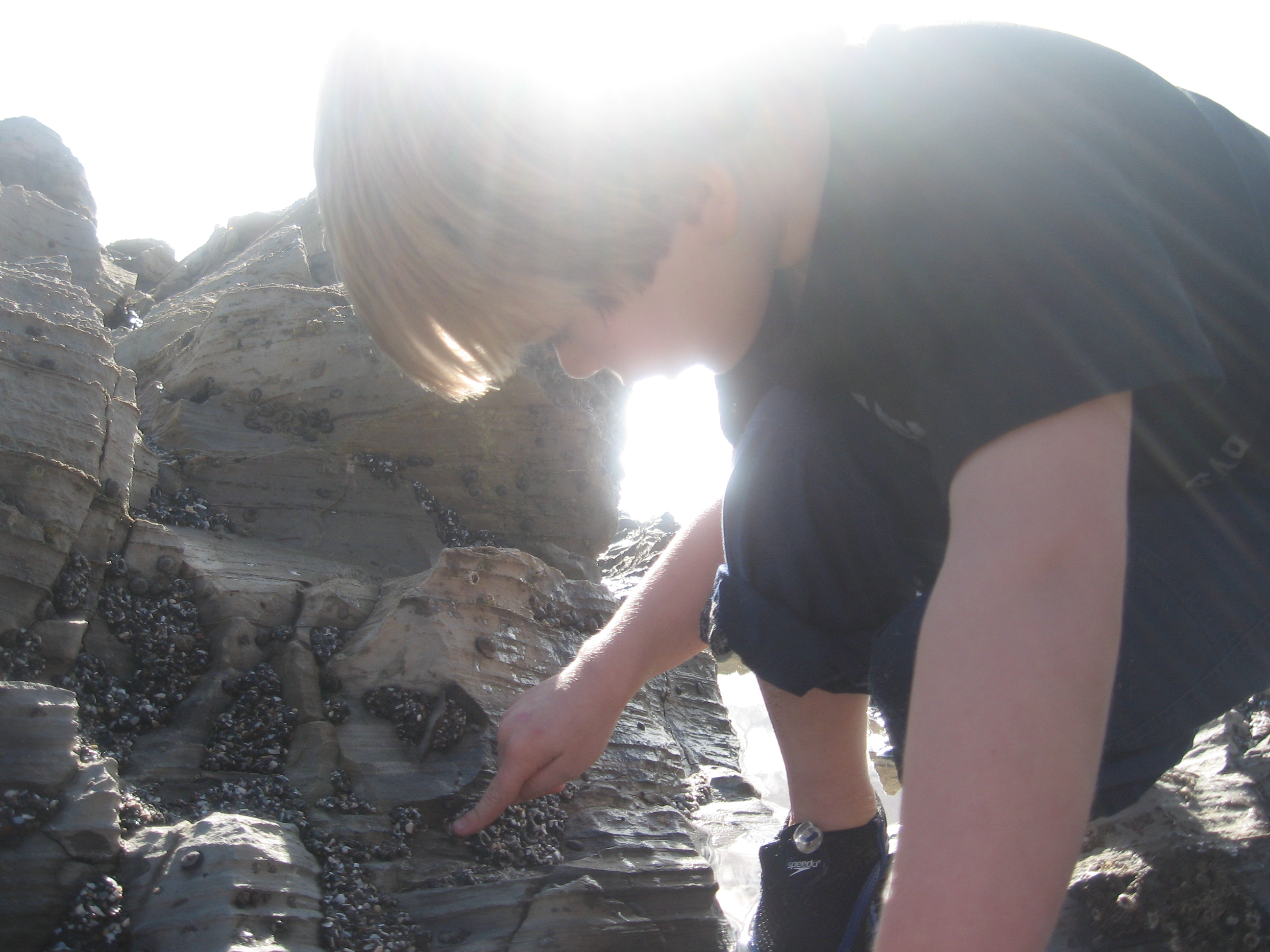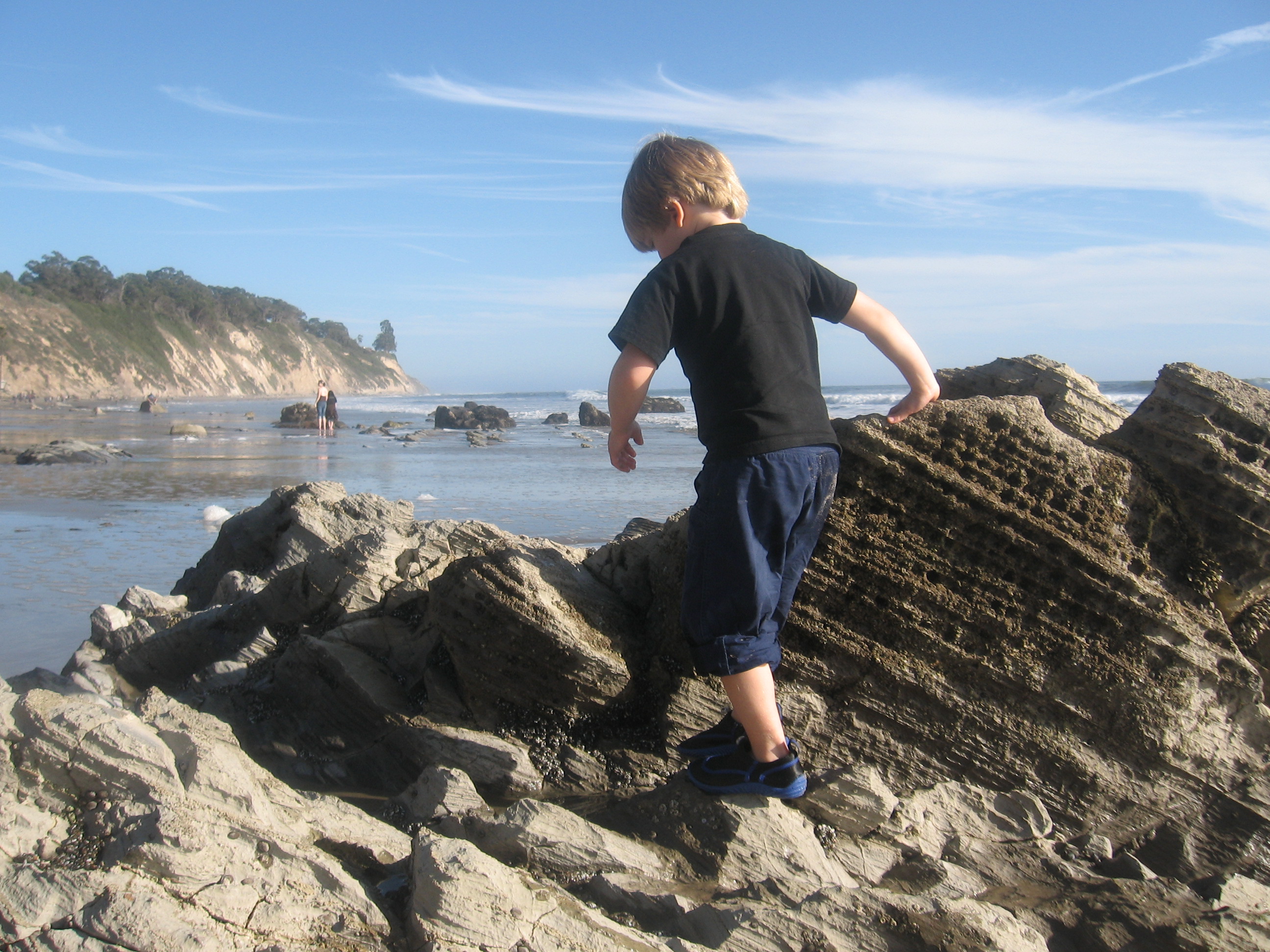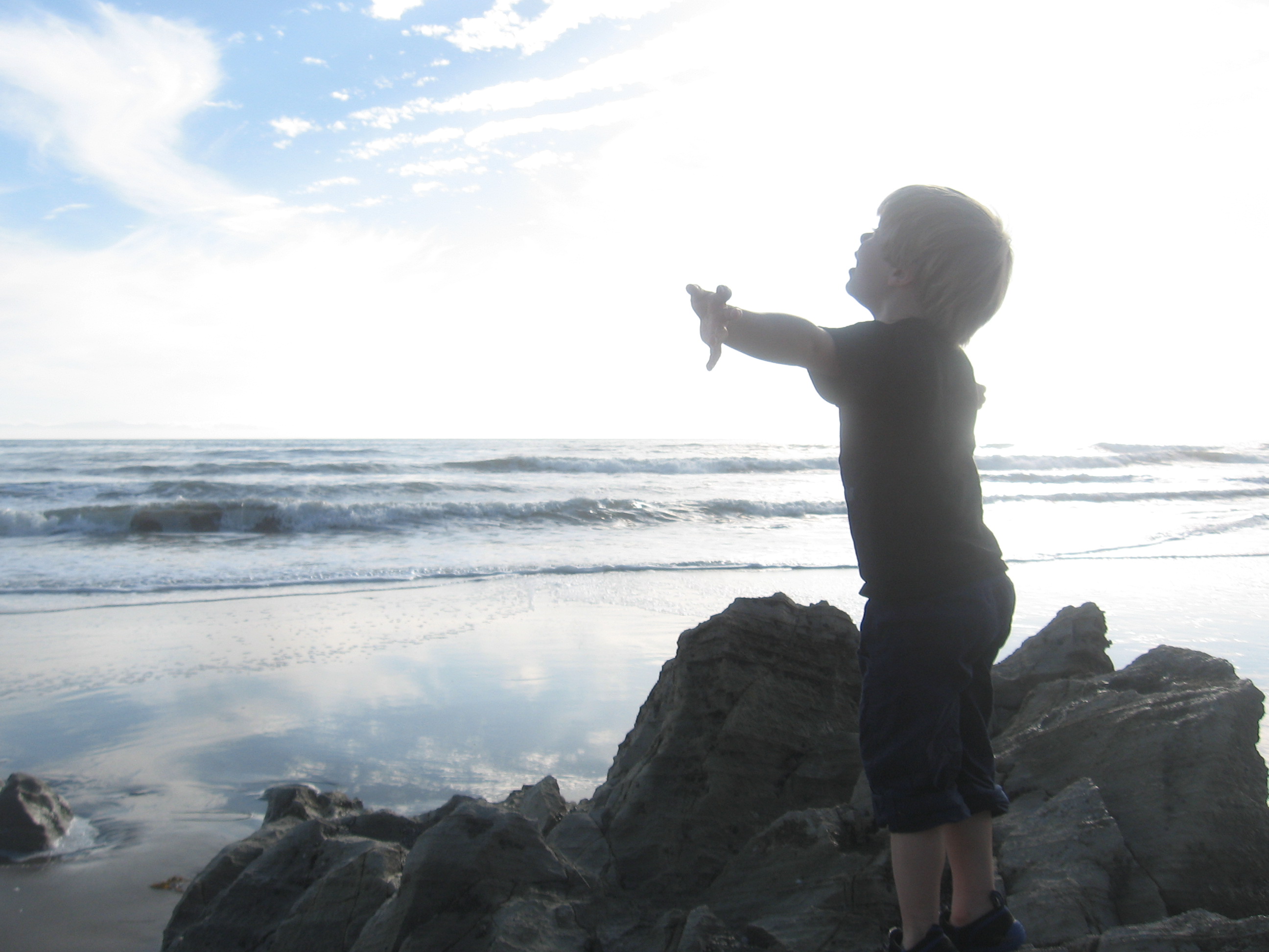 I rediscover the world through my son as I watch him make games out of rocks exposed by the minus tide. So many possibilities for the imagination. Taking a closer look at shape, lines, gaps. Not taking a single portion of beach for granted, finding the new in all of it. When was the last time you draped yourself over a sunwarmed rock and closed your eyes? Jumped. Ran for no reason except that it feels good. Found a half-buried starfish, tossed it back. Picked up a shell glistening with sea water, kept it. Faced the wind and shouted. Poked anemones (gently). Teaching him about the beach teaches me to look more closely at just about everything. Ah, you’re thinking. Now she’s going to bring her writing into it–closer readings, experimenting whilst revising her novels (ad nauseum), etc…