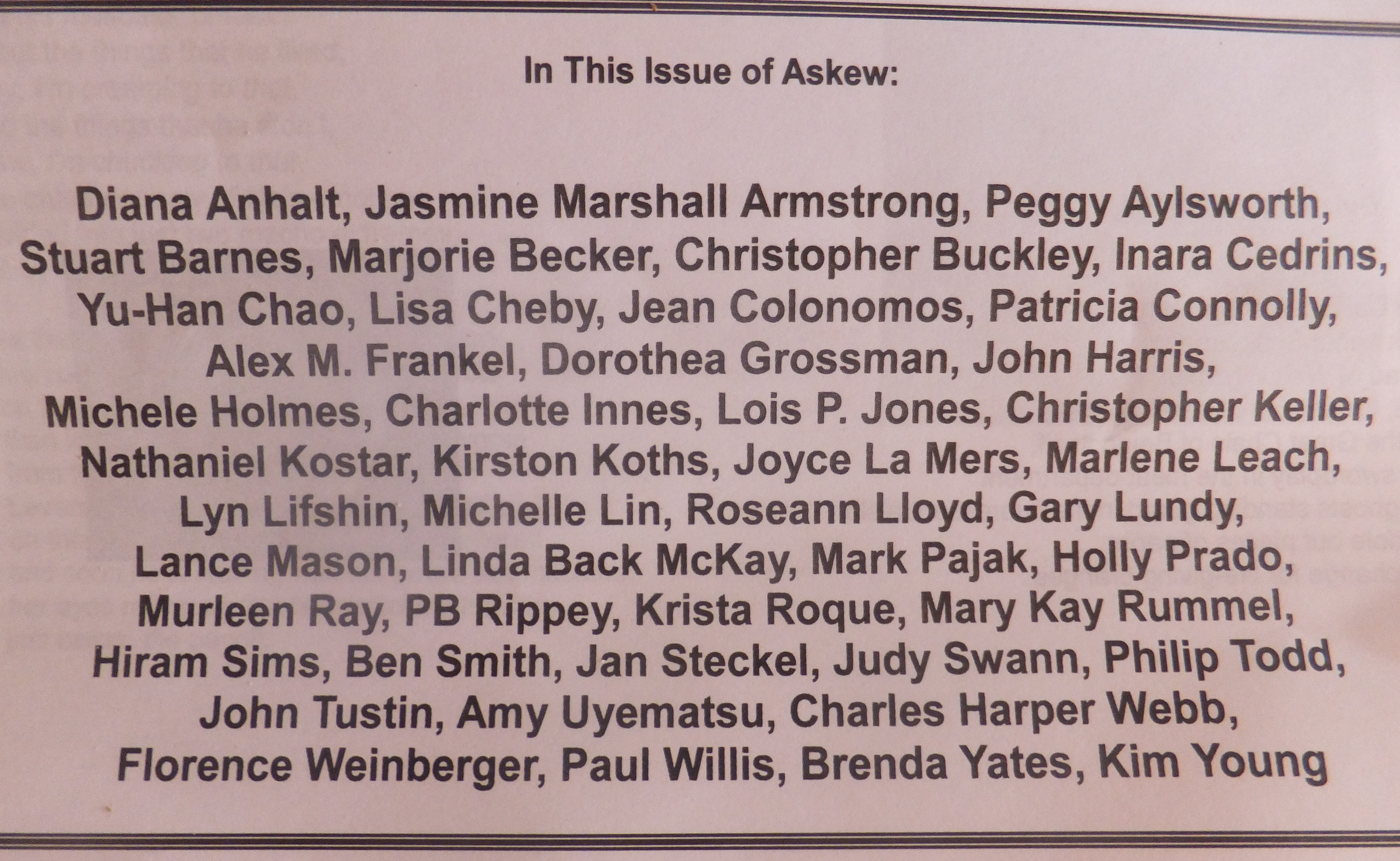 My poem is out in Askew Poetry Journal’s Issue #12 Spring/Summer 2012 (here’s the link to Askew in case you’re interested in submitting or subscribing). They also have a Facebook page with samples of poetry from this issue. Dorothea Grossman’s poems are a delight and a reminder that less can definitely be worlds. Holly Prado’s ‘sonnet’ is fun and jolting. No, fun is not the right word. I’d tell you the right word and give a little review of this issue, but I haven’t slept much lately…Far easier to bite a marshmallow and watch an episode of Doc Martin, Season 5. And convey that once Louisa’s brain clears from the sleeplessness of new-motherhood, she’ll move out of the surgery and move on. The Dr. is not evolving, he is regressing. Damn those writers…2 poems in this issue of Askew contain the word askew. And the journal’s motto: Tell all the Truth but tell it slant—by, of course, Emily Dickinson, is used in a contributor’s poem…After the 4th cup of coffee I usually realize caffeine is not going to help—still, sometimes I ingest a pick-me-upper cupper around 3pm—and can be counted on to discover, too late (very late), that it was not a good idea…How Prado uses both my bougainvillea-arm and coyote air to end her sonnet made me want to read the poem again. Then again. And Prado’s reason for why sonnets can’t stand Los Angeles I quite agree with. Although I don’t believe the answer is meant to be agreed or disagreed with…True story: I once knew someone who renamed herself Ellipsis, because she thought the word sounded beautiful…There are many quotable lines from Holly Prado’s sonnet. I recommend subscribing to the journal just so you will receive that poem in the mail—oh, yes! Askew is a poetry journal you hold in your hands, your morning coffee standing by, steaming promisingly as your fingers turn pages smooth as cornsilk. They’re not cornsilk pages. But they are very smooth..Nora Ephron died today. I’m quite sad about it. She forged, she smote, she conquered. One of Dorothea Grossman’s poems is titled, For The Newly Bereaved: It doesn’t matter/whether you open the door/turn on the music/or stand up./All you really have to do/is feed the cat…I didn’t know Dorothea Grossman died last May…My poem is not a sonnet, does not contain the word askew (although the speaker is definitely off-kilter), has nothing to do with terminal illnesses or heartbreak and it does not contain an ellipsis. Since rights revert back to me upon publication, here it is. Goodnight and may your dreams be quiet little canters, not even the tiniest image of Legoland tainting their gauzy borders.