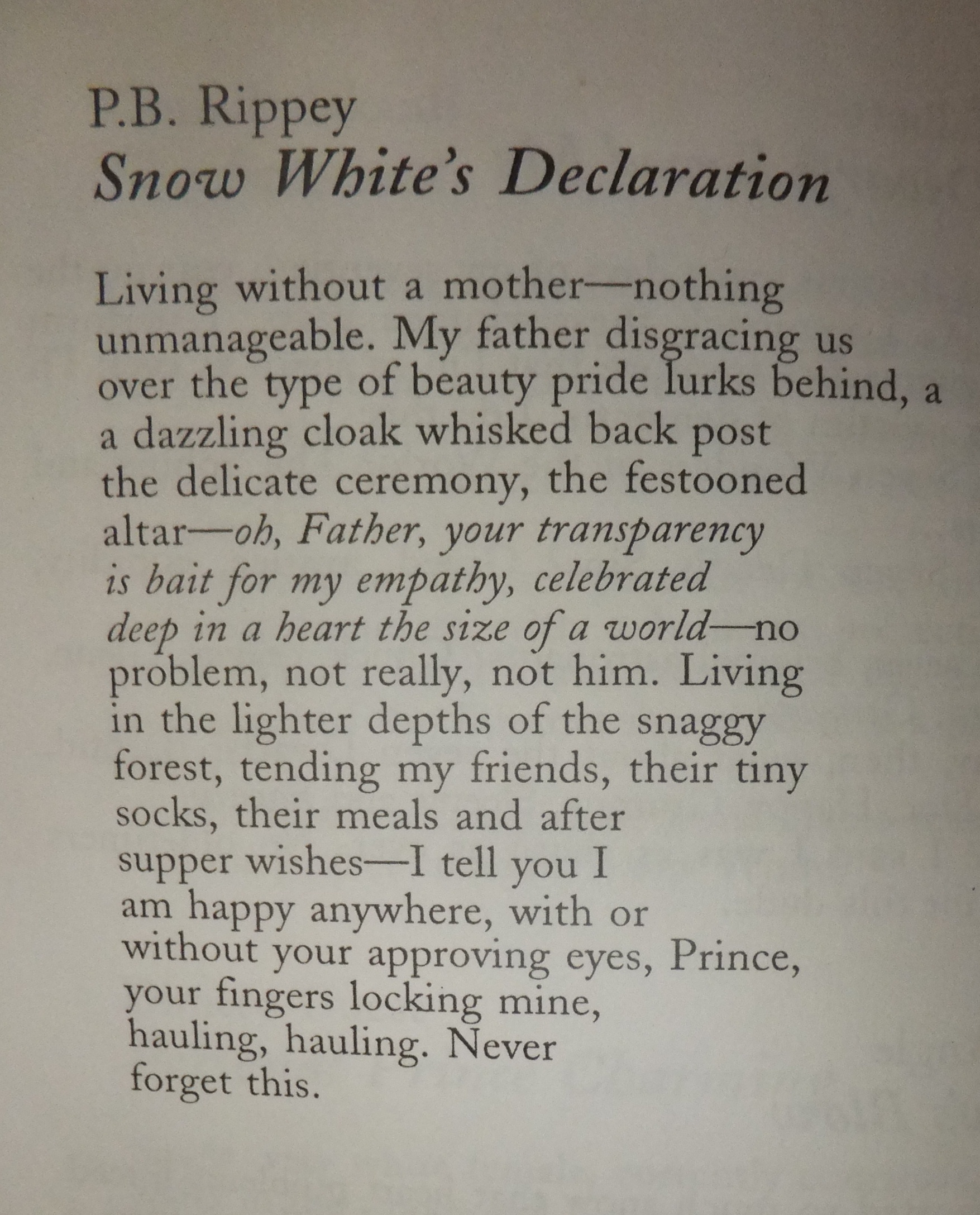 And just like that, 2 hours of sitting in traffic was replaced by the type of couch that swallows you in a smooth, nerves-loosening manner, windows looking out on lush greenery, walls hung tastefully in my sister’s collection of California plein air, and an ocean breeze swooping in through the open front door, fluffing my hair, cooling skin. Twilight. The magic hour. I sipped chardonnay from a heavy glass with bas relief-ish bees on it. My sister’s friend chatted enthusiastically about Santa Barbara poets we both know and how cool it was for him to have a poem in a Snow White revisited sort of book by those local publishers who aren’t around anymore, you know, who were they, those publishers, my sister’s friend mused aloud. Well, he said, you must remember, you’re in that book, too. I blinked at him. I am? Yeah, you know, the Snow White book, he insisted. I have that book, my sister said, entering the room with a pizza that smelled like a gourmet chef just dropped it off for us. It’s a thin book, red, on the shelf. The three of us looked for it. I found it. They never told me, I said. I assumed they’d either rejected me, or never published the book. I paged through to my poem, one I haven’t thought about in 9 years. I plopped on the couch, the breeze fanning the pizza’s aroma through the artsy bungalow, and read. I felt like a local. I felt good! Huh, I said. There’s a typo.
