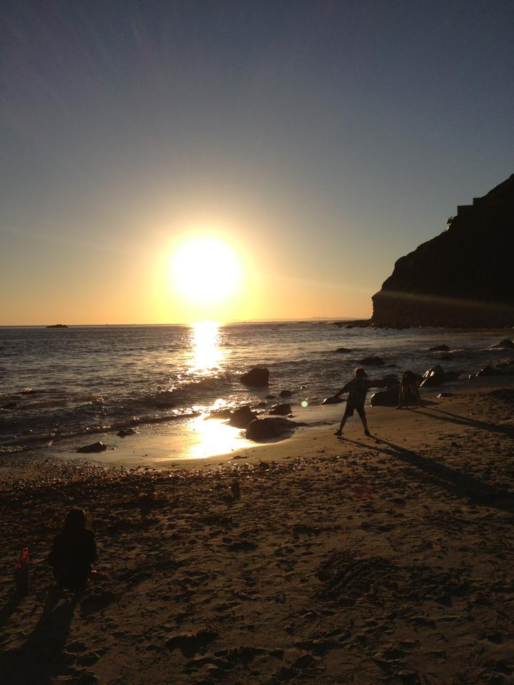 The doctor said a slight fever would come. “Reaction” to a shot. He was feverish for a day. The next, he sneezed and went a little hoarse. But the fever was gone and he was uber-perky and when I meekly told him that maybe we shouldn’t go he threw back his head, opened his mouth and sobbed. And I thought: He is not bedridden. So I gave him a spinach smoothie disguised as a blueberry smoothie, loaded us up and we went, straight into traffic, inching north despite taking all the secret, eucalyptus tree-lined back roads I know which everyone else in the world knows about now, apparently, and when we finally arrived we immediately experienced an exuberance-high upon seeing children and elders and I loaded everyone up and we tried other secret back roads to the beach (twisting oaks and hydrangea on steroids) and the roads worked and suddenly we were well into an ocean’s frisky sundowner, splashing in cold velvet surf (despite my fear of great white sharks hunting at dusk) and, later, dining at a table on the sand, taking huge bites of tonic-air with our ahi tuna salads, grilled cheese sandwiches, strawberries and pleasantly warmed fries and I finished my meal and chatted with the elders, eyes flicking from dazzling ocean to children climbing the lifeguard stand and I thought: I so belong here. And I pulled my awkward black journal thing out of my purse, yanked out the pen I was forced to scrounge for and excused myself from the conversation, about to write a little something down