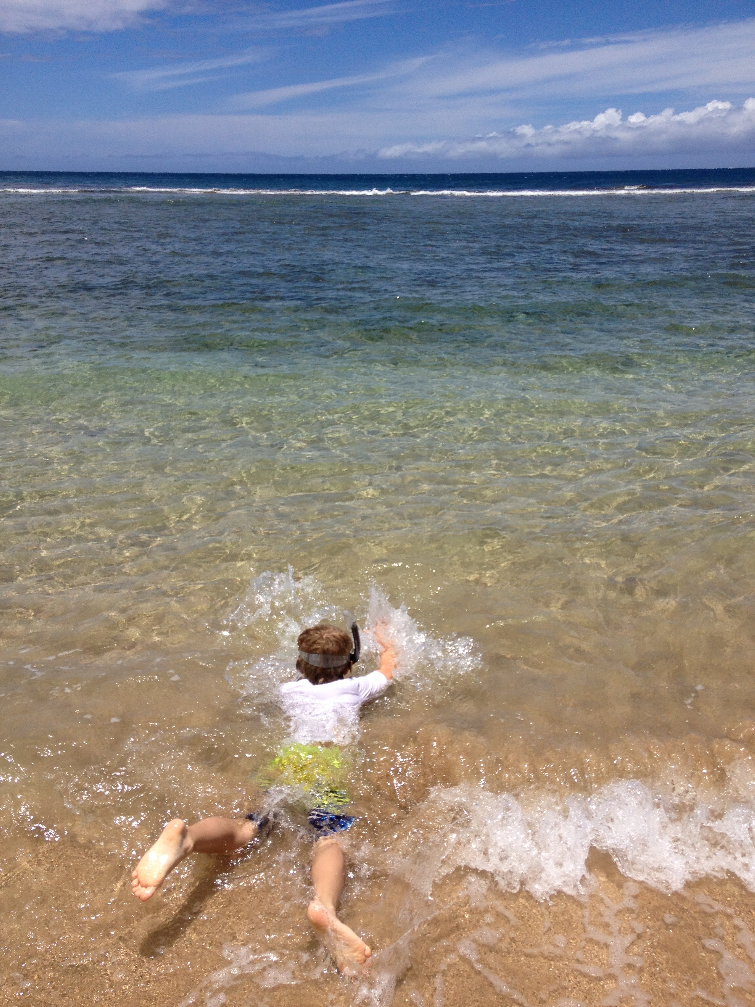 I know as well as anyone how distracting ocean is—sunrises, sunsets, all the dancing, lightening blue in between those hours–and distraction was the norm on our island. I barely finished morning coffee before our feet were in glassy, snorkel-and-mask-navigable water. I rose in the middle of the night and sat on the balcony, staring at glowy incoming froth and surge, my heart synching with wave rhythm, sky the dark, sparkling gown of a Disney princess with an edge. We traveled with snorkeling gear and body boards in the trunk at all times, scouting out those beaches where we’d hold hands and glide through shallows, snorkel-gasping at the darting rainbows beneath us. Each dusk, after dinner, we were there again, knee deep in ripples, silhouetted by sky fire as sea turtles nibbled lagoon bits a couple of feet from our toes. Who can write when vacationing by/in such ocean?