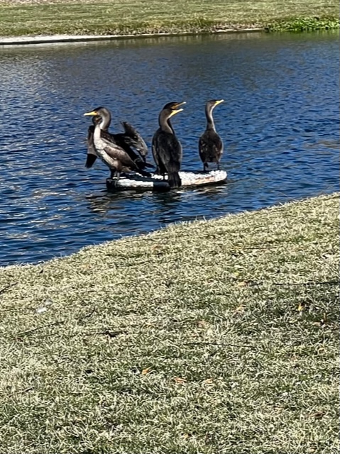 I don’t know why the cormorants are here and not the ocean, Ventura’s beaches, or Santa Barbara’s, where their kin thrive. There’s only teeny tiny fish in our pond. Turtles. Certainly a reliable midday peace, still…