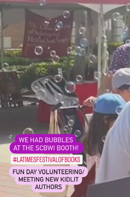 The SCBWI-LA booth was busy on Sunday 4/23! Wonderful for the authors signing books. So many parents and kids visited our booth, it couldn’t have just been the bubble machine attracting everyone–I mean, even meandering teens lingered. Zeena M. Pliska, Maureen Charles, Christine Van Zandt, Lori Polydoros–thank you for the time you took to chat with me. AND it’s always a delight to hang with author Robert Mellette.