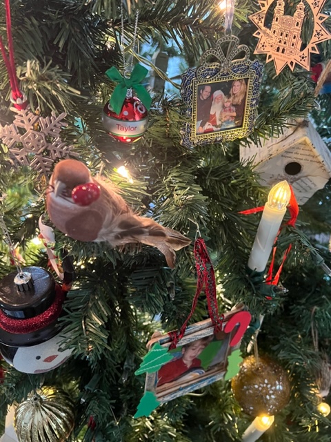 When I close my laptop and the house isn’t stirring, not even a cat (or a teen), tiredx10 from walking the crazy girl earlier in the day, bleary-eyed from revising topics I must believe in because I keep on writing and keep on revising them, I sit before our tree decorated in memories and it reminds me to breathe.