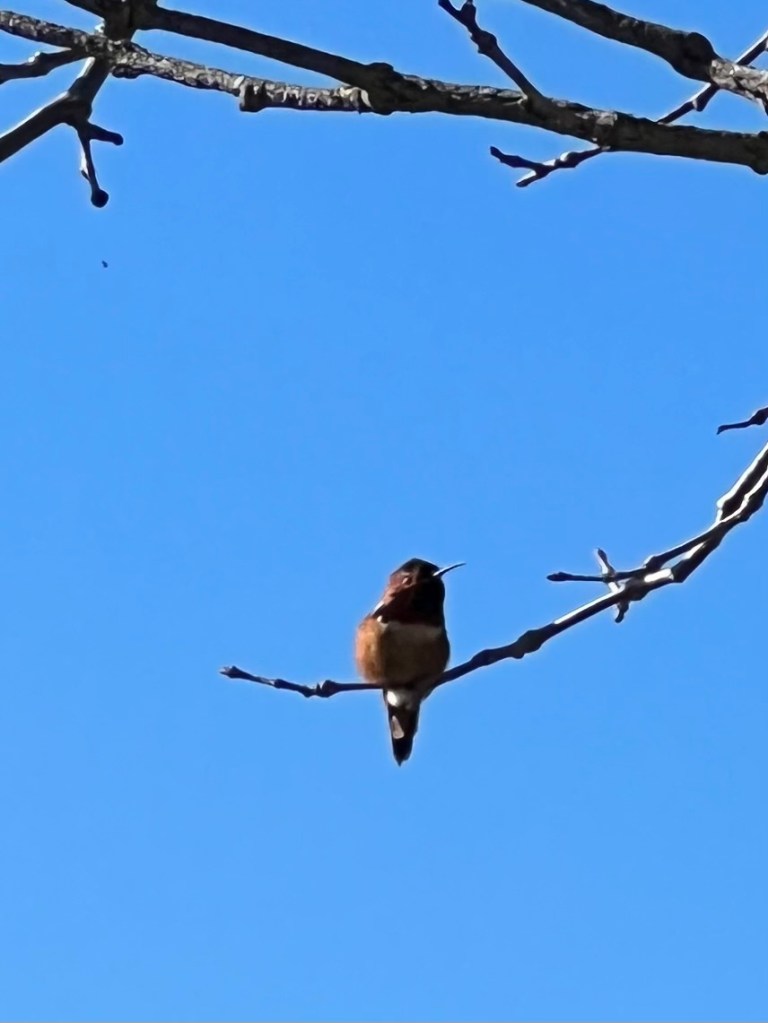 Hummingbird on a branch, seen on my first powerwalk of 2024. The only bird that can fly backwards. Did you know they also catch insects with their whip-tongues?