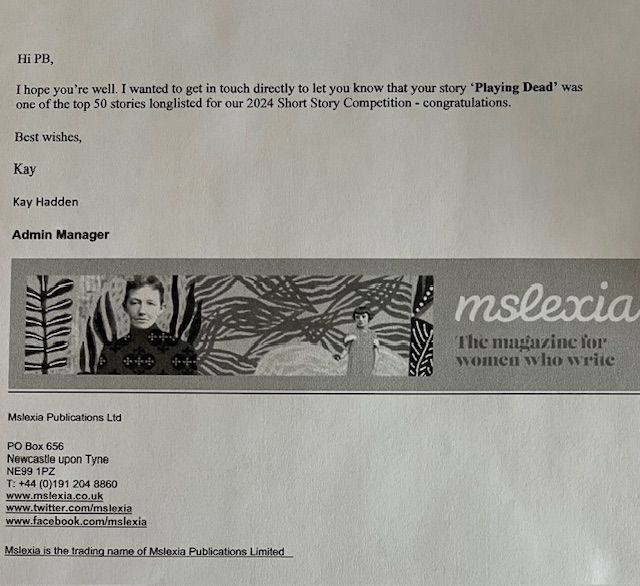 I was just informed that my short story, PLAYING DEAD made the longlist for the Mslexia 2024 short story prize. I luff Mslexia. This is a big deal for me. The best part is I can tell my teen about it when I pick him up from school today.